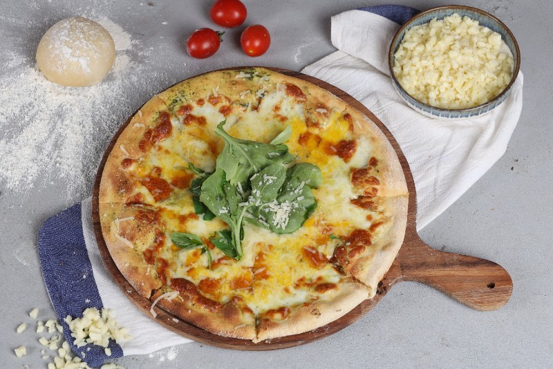 Mozerella peyniri pesto sos cheddar peyniri rokfor peyniri parmesan peyniri ve roka ile servis edilir.