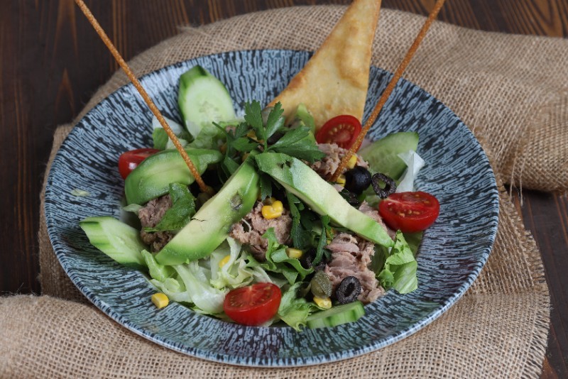 Mix yeşillikmısırcapari çiçeğisoğanmısırzeytinközlenmiş biberdomates salatalık ve ton balığı ile servis edilir.