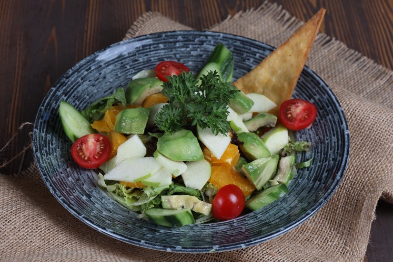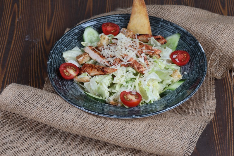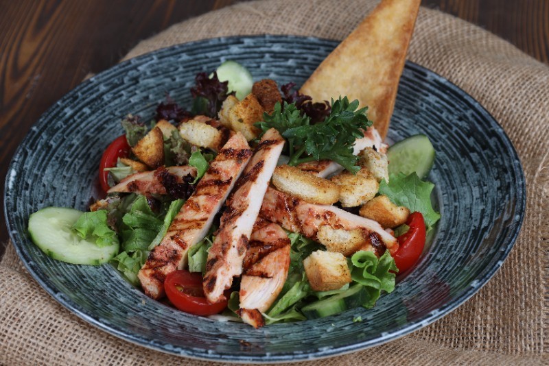 Mix yeşillik kroton ekmeği domatessalatalık ızgara tavuk ile servis edilir.