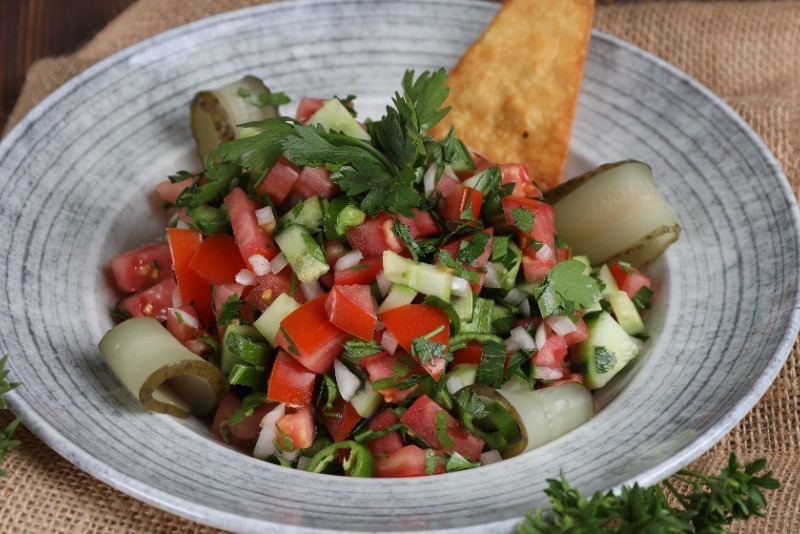 Mix yeşillikmısırzeytinbeyaz peynirközlenmiş biberdomates ve salatalık ile servis edilir.