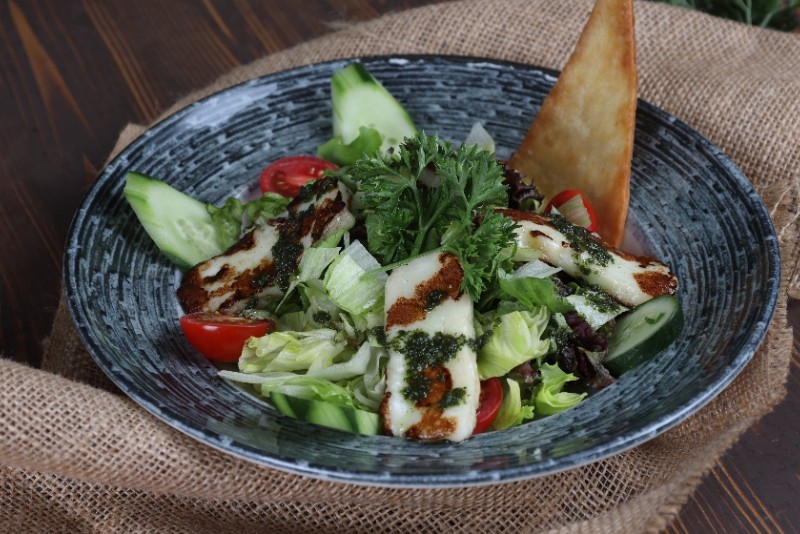 Mix yeşillik ızgara hellim peyniri mısır köz biber domates salatalıkzeytin ve yeşil elma ile servis edilir.