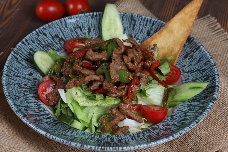 Mix yeşillik jülyen ızgara bonfileközlenmiş biber mısır domates salatalık ve parmesan peyniri ile servis edilir.