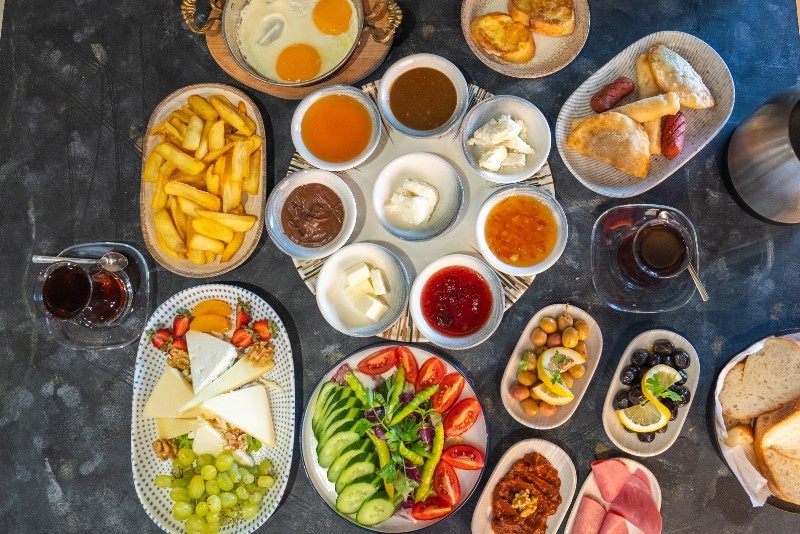 Ezine Beyaz Peynir Taze Kaşar Çeçil Peyniri Domates Salatalık Biber Dana Salam Vişne Reçeli Bal kaymak Nutella Siyah Zeytin Yeşil Zeytin Peynirli Sigara Böreği
